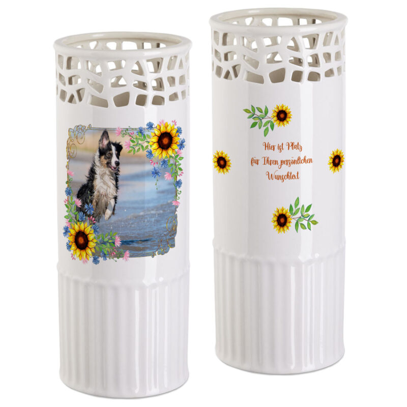 weiße Blumenvase mit Foto im Sonnenblumenrahmen und Wunschtext